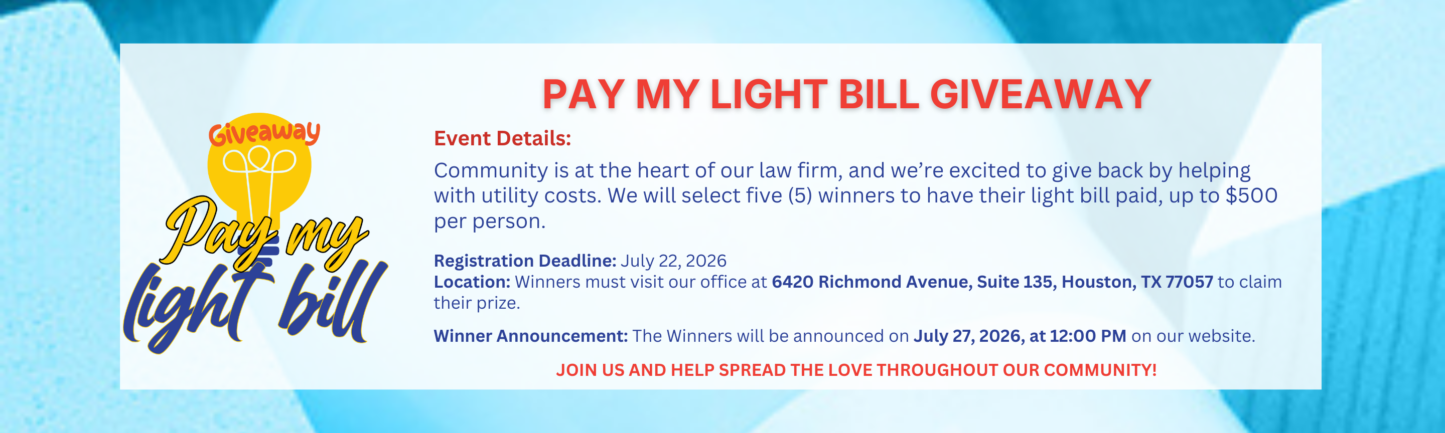 Join us for another community giveaway! Community is at the heart of our law firm, and we’re excited to give back by helping with utility costs.