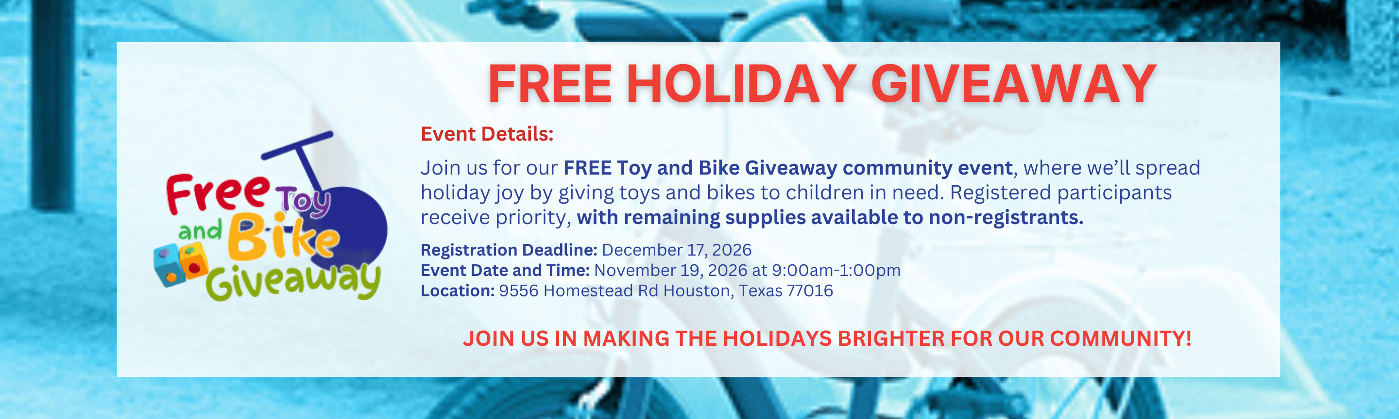 Join us for a heartwarming holiday celebration at our FREE Toy and Bike Giveaway Community Event! We’re spreading joy by providing free toys and bikes to children in need.
